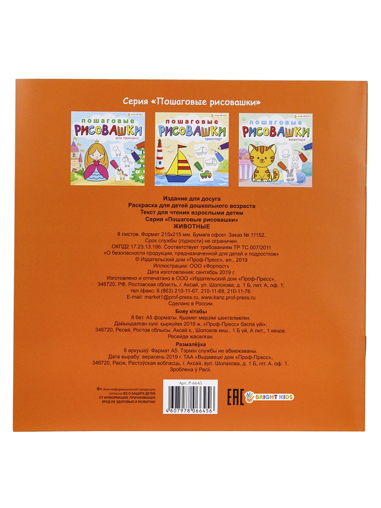 Необычные и увлекательные раскраски понравятся каждому ребёнку. Красочная "Пошаговая рисовашка" научит рисовать и поможет развить воображение и мелкую моторику малыша. Формат: А4, 8 листов. Полноцветная печать. Мелованная обложка, внутренний блок: офсет. Крепление: скрепка. Размер: 215х215 мм.
