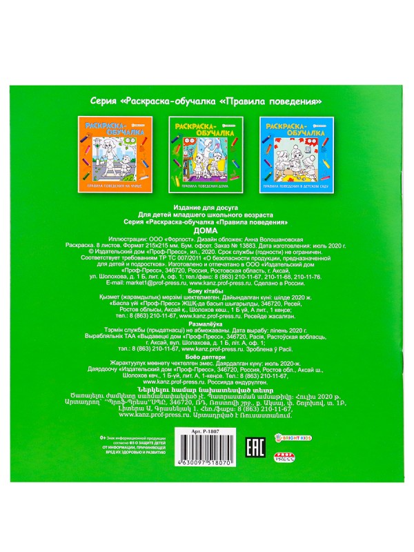 Необычные и увлекательные раскраски от компании "Проф-Пресс" понравятся каждому ребёнку. Серия раскрасок-обучалок специально направлена на изучение ребенком правил поведения в разных местах. Полноцветная печать. Обложка: целлюлозный картон. Внутренний блок: офсет. Крепление: скрепка. Размер: 215х215 мм.