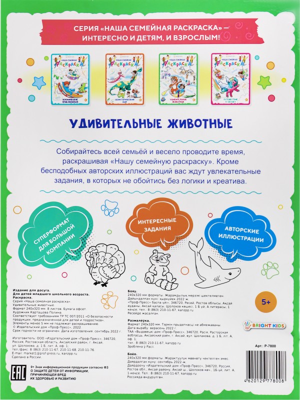 Серия "Наша семейная раскраска" понравится не только детям, но и родителям. Ведь так здорово провести совместный досуг за увлекательным занятием! На страницах раскраски вы найдёте большие иллюстрации, которые вам предстоит раскрасить вместе с ребёнком. Придавайте цвет иллюстрациям карандашами, красками, фломастерами, цветными ручками. Издание состоит из 8 листов (240х320 мм). Яркая обложка выполнена из целлюлозного картона плотностью 200 г/м2, внутренний блок — офсет плотностью 100 г/м2. Крепление: скрепка.