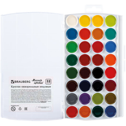Купить Краски акварельные BRAUBERG "МАГИЯ ЦВЕТА" 32 цвета, медовые, круглые кюветы, пенал, 192684 вы можете в компании Канцтовары Карандашов, оформив заказ в интернет магазине, или