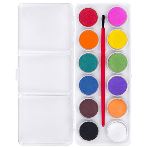 Краски акварельные ПИФАГОР "СОЛНЫШКО", 12 цветов с кистью, круглые кюветы, пенал, 192635