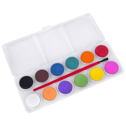 12 ярких цветов отлично смешиваются между собой и позволяют создать множество оттенков. Краски быстро высыхают и не портятся со временем. Безопасны для детей, нетоксичны. Выпускаются в пластиковом пенале и дополнительном пакете, кюветы круглой формы и кисточка в комплекте. Упаковка обладает компактными размерами и легким весом.