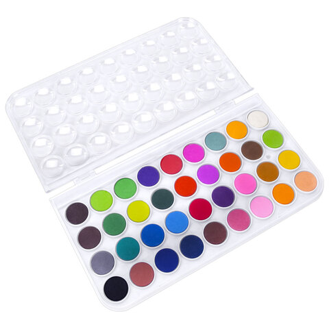 В наборе 36 насыщенных цветов, которые отлично смешиваются, позволяя создавать множество оттенков. Краски легко наносятся, образуя интенсивное яркое покрытие даже при нанесении в один слой. Обеспечивают однородное окрашивание, быстро высыхают и не портятся со временем. Краски безопасны для детей, нетоксичны. Выпускаются в пластиковом пенале с европодвесом, прозрачной крышкой, круглой формой кювет и отделением для кисточки. Съемную пластиковую крышку можно использовать в качестве палитры для смешивания красок.
