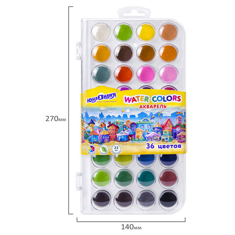 Краски акварельные ЮНЛАНДИЯ "ДОМИКИ", 36 цветов, круглые кюветы 23 мм, пенал, 192633