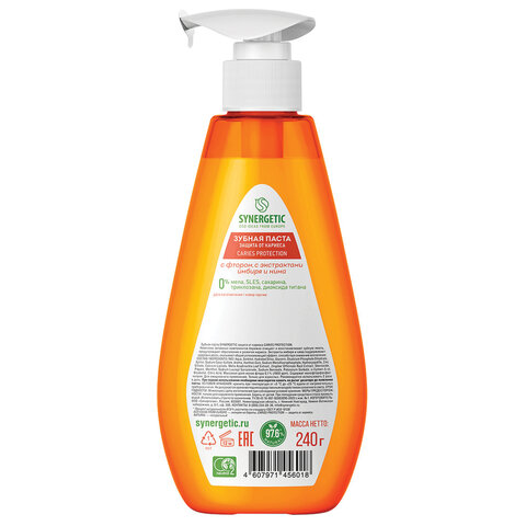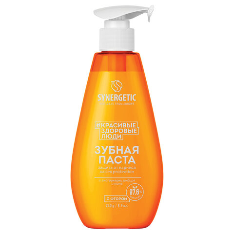 Купить Зубная паста 240 мл, SYNERGETIC "Защита от кариеса", с экстрактом имбиря и нимом, дозатор, 201022 вы можете в компании Канцтовары Карандашов, оформив заказ в интернет магазине, или