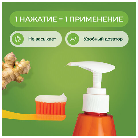 Безопасная формула для защиты от кариеса с фтором и экстрактами имбиря и нима. Не содержит мела, SLS, SLES, сахарина, парабенов, триклозана, диоксида титана. Удобный формат флакона обеспечивает экономичный расход.