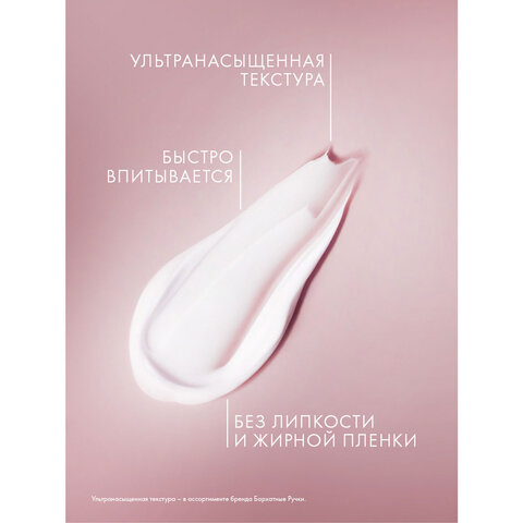 Ультранасыщенная текстура быстро впитывается, не оставляет липкости и жирной пленки. Чувственный цветочный аромат с нежными пудровыми нотами подарит особое удовольствие во время использования.