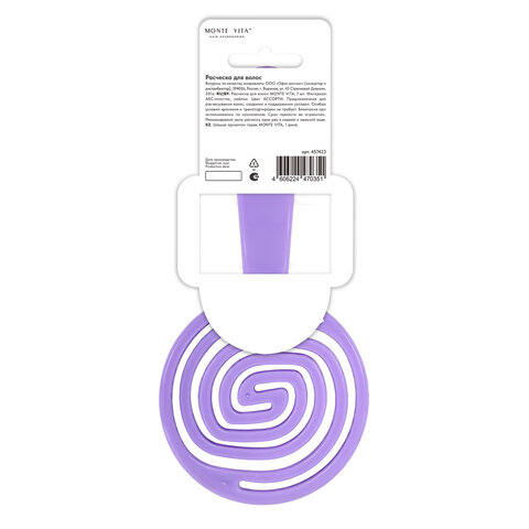 Расческа для волос массажная, широкая, 24х8 см, фиолетовая, MONTE VITA (МОНТЕ ВИТА), 457419