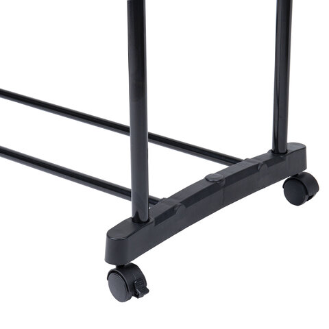 Две железных перекладины вмещают до 25 плечиков, распределенная нагрузка – до 30 кг. Перекладина оснащена ограничителями, предотвращающими соскальзывание плечиков. Внизу полка для размещения обуви, коробок или органайзеров. На ножки устанавливаются колесики для удобного перемещения. Мобильная благодаря минимальному весу.