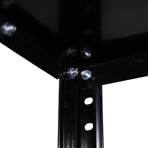 Для повышения жесткости всей конструкции верхнюю и нижнюю полку нужно усилить дополнительными Г-образными уголками (поставляются в комплекте 16 шт.). Промежуточные полки собираются без усиления.
