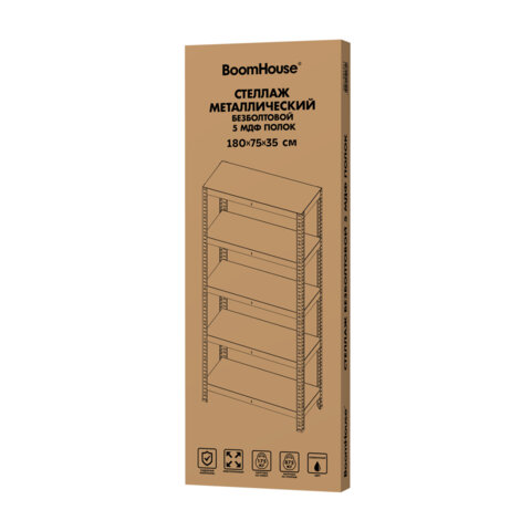 Купить Стеллаж металлический BOOMHOUSE (БУМХАУС) безболтовой, 1800x750x350 мм, 5 полок МДФ, нагрузка на стеллаж до 875 кг, серебристый, 291411 вы можете в компании Канцтовары Карандашов, оформив заказ в интернет магазине, или