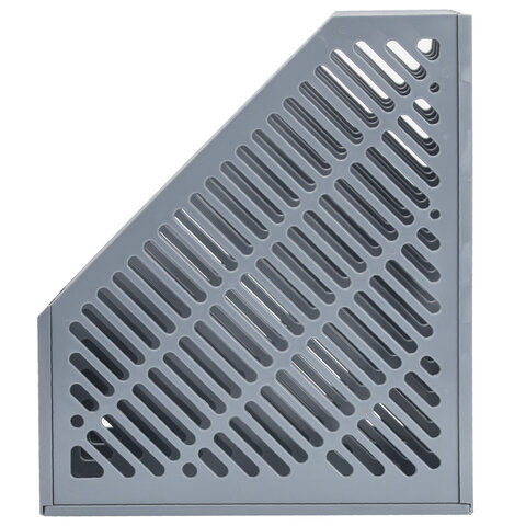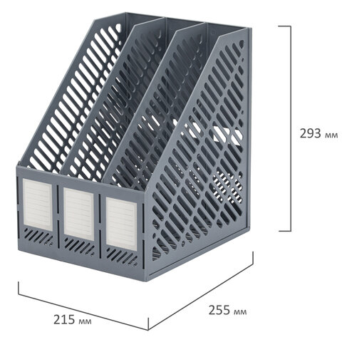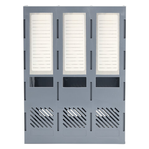 Выполнен в сером цвете с тремя отделениями и с табличками для маркировки. Предназначен для хранения бумаг формата А4. Представляет собой устойчивую разборную конструкцию с сетчатыми поверхностями. Поставляется в разобранном виде. Размеры: высота - 293 мм, ширина - 215 мм, глубина - 255 мм.