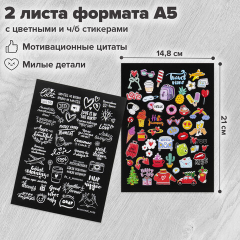 В комплекте с фотоальбомом: 1 лист (формата А5) черно-белых и 1 лист (формата А5) цветных стикеров, 204 самоклеящихся прозрачных уголка для фото, белая гелевая ручка и клей-карандаш. С помощью дополнительных аксессуаров фотоальбом можно сделать уникальным.