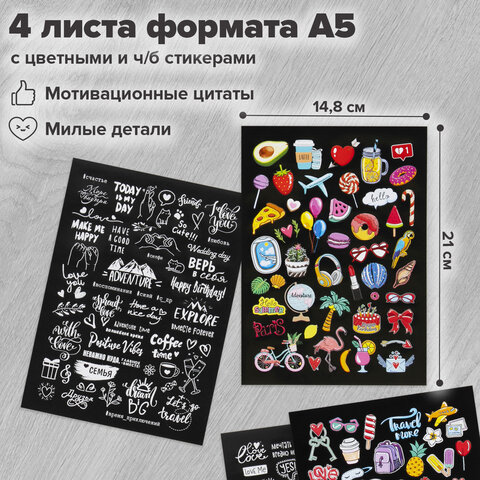 В комплекте с фотоальбомом: 2 крупных надписи (размером 3,7x13,2 см), 2 листа (формата А5) черно-белых и 2 листа (формата А5) цветных стикеров, 408 самоклеящихся прозрачных уголков для фото, золотистая и черная гелевые ручки, а также клей-карандаш. Плотность обложки и внутренних листов – 300 г/м2. Большое количество дополнительных аксессуаров поможет сделать фотоальбом уникальным.
