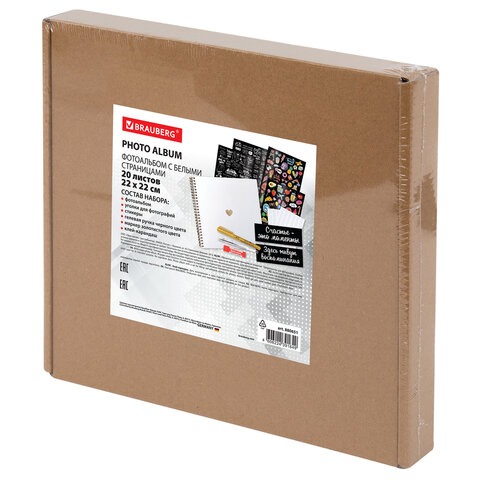 Фотоальбом 22х22 см, 20 белых листов, уголки, стикеры, ручки, клей, BRAUBERG White Line, 880651