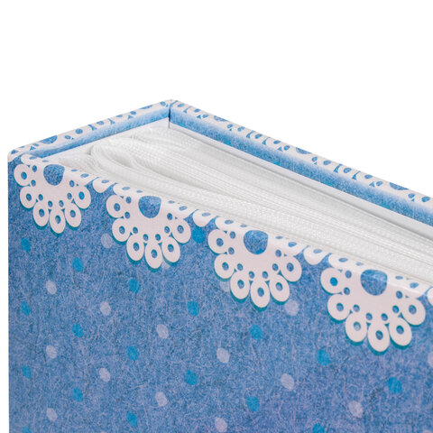 Состоит из 50 полипропиленовых листов размером 17,5х22 см с карманами и вмещает 200 фотографий размером 10х15 см по 2 штуки на странице. Обложка фотоальбома выполнена в голубых тонах, в детском дизайне с изображением пинеток, а его листы склеены в единый блок. Размер – 18х23 см.