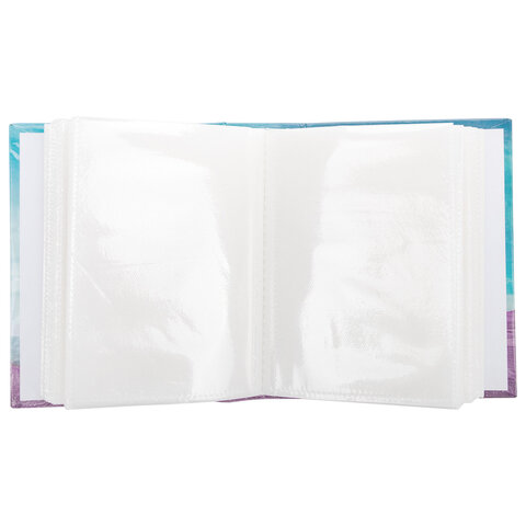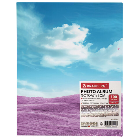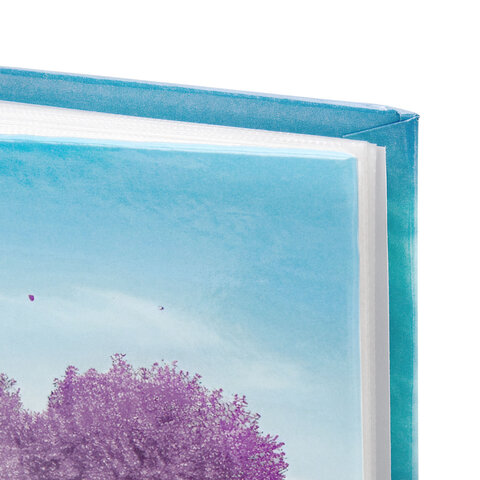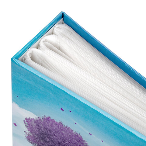 Состоит из 50 полипропиленовых листов размером 12х15,15 см с карманами и вмещает 100 фотографий размером 10х15 см по 2 штуки на странице.