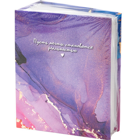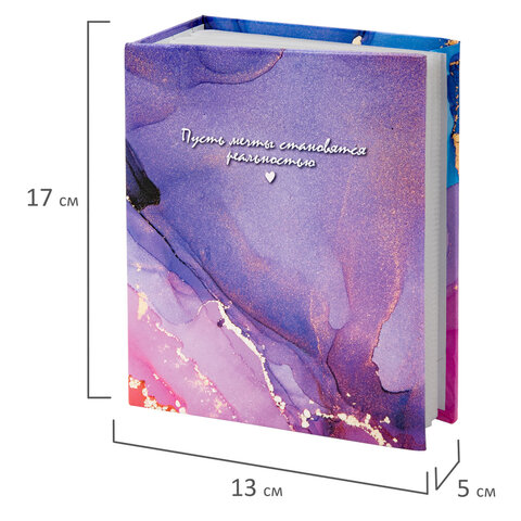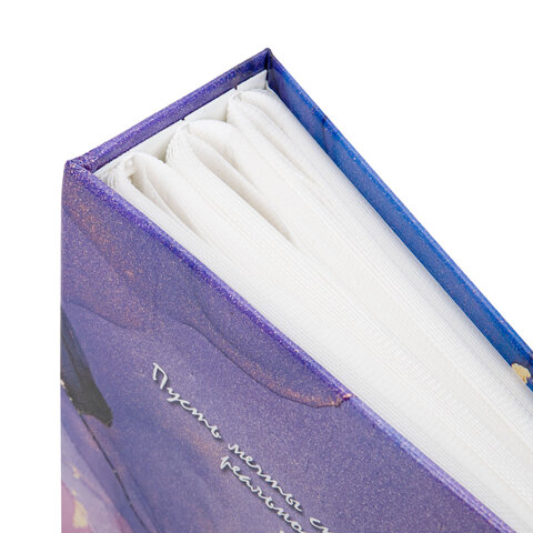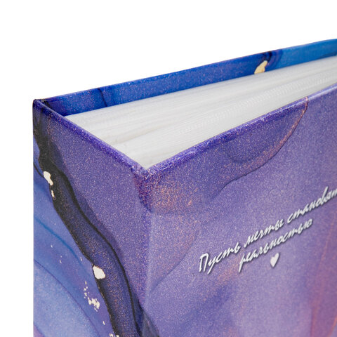 Состоит из 50 полипропиленовых листов размером 12х15,15 см с карманами и вмещает 100 фотографий размером 10х15 см по 2 штуки на странице.
