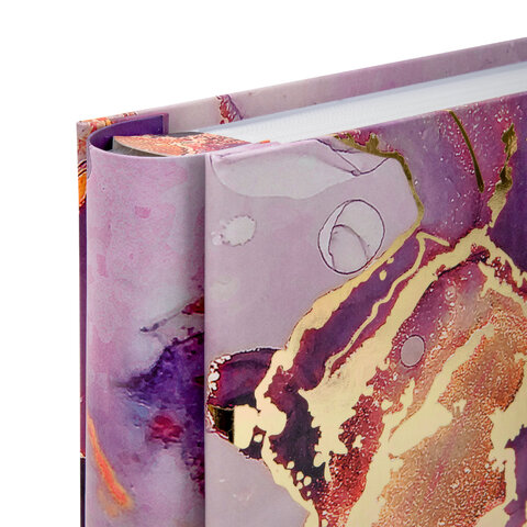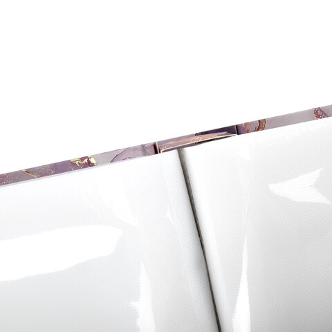 Состоит из 100 полипропиленовых листов размером 15,5х24,5 см с карманами и вмещает 200 фотографий размером 10х15 см по 2 штуки на странице. Обложка фотоальбома выполнена под мрамор и декорирована золотой фольгой. Фотоальбом с винтовым переплетом отличается повышенной прочностью и долгим сроком службы. Имеются поля для подписей.