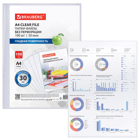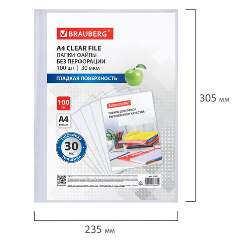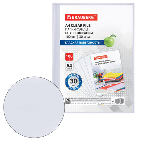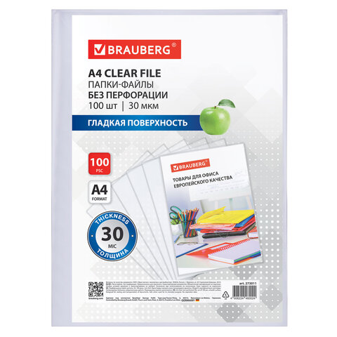Купить Папки-файлы БЕЗ ПЕРФОРАЦИИ для хранения и защиты документов А4 BRAUBERG, КОМПЛЕКТ 100 шт., гладкие, 30 мкм, 273011 вы можете в компании Канцтовары Карандашов, оформив заказ в интернет магазине, или
