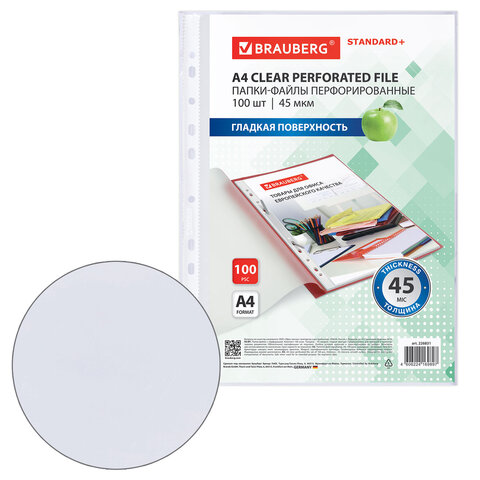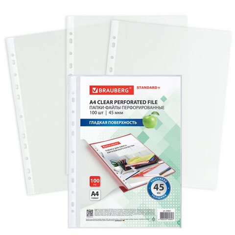 Купить Папки-файлы перфорированные, А4, BRAUBERG "STANDARD", комплект 100 шт., гладкие, 45 мкм, 226831 вы можете в компании Канцтовары Карандашов, оформив заказ в интернет магазине, или