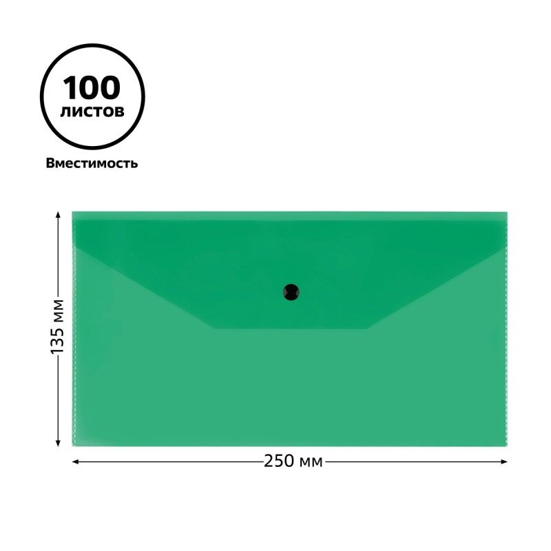 Папка-конверт на кнопке «СТАММ» формата С6+ изготовлена из качественного полипропилена толщиной 150 мкм. Размер изделия составляет 250*135 мм, ориентация – горизонтальная. Предназначена для хранения и транспортировки бумаг. Папка плотно закрывается клапаном с кнопкой и надёжно защищает документы от влаги и пыли. Имеет глянцевую текстуру. Вместимость – до 100 листов. Цвет изделия – зелёный.