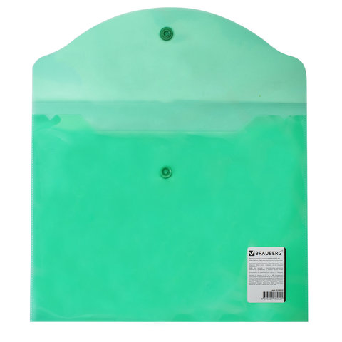 Папка-конверт с кнопкой BRAUBERG, А4, до 100 листов, прозрачная, зеленая, СВЕРХПРОЧНАЯ 0,18 мм