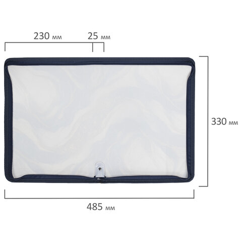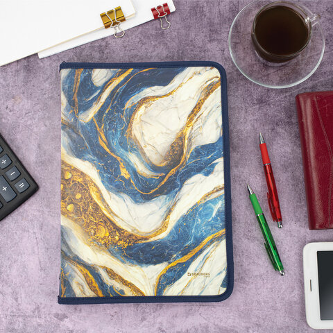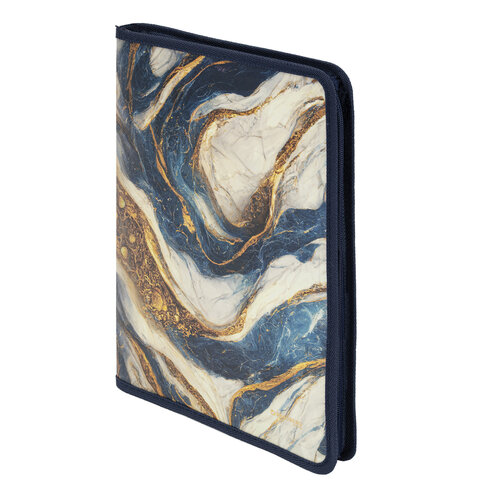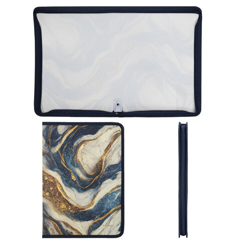 Изготовлена из прочного непрозрачного пластика толщиной 500 микрон. Формат А4 (330x230 мм). Надежный замок-молния защищает документы от механических повреждений, пыли и влаги. Папка представлена в красивом мраморном дизайне.