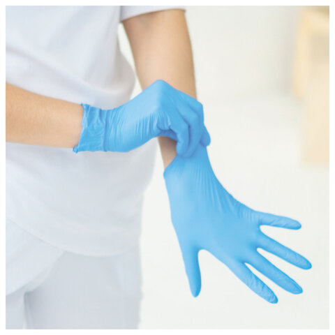 Гипоаллергенные перчатки из 100% синтетического нитрила голубого цвета.