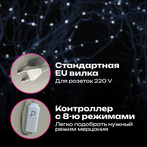 Цвет свечения гирлянды – холодный белый. Конструкцией гирлянды предусмотрено наличие контроллера для принудительного переключения между режимами свечения. Количество режимов свечения – 8 шт.