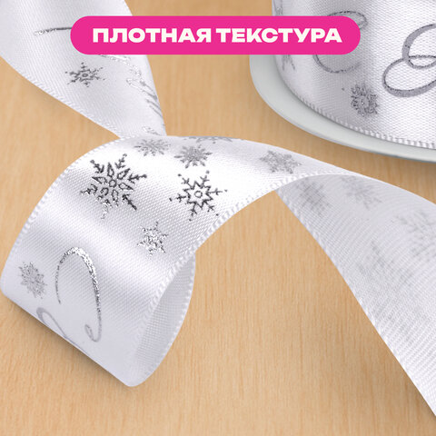 Лента шириной 25 мм и длиной 5 м изготовлена из прочного полиэстера (100%). Плотность ленты – 0,11 г/м2. Цвет – белый, на лицевой стороне имеется серебристое тиснение.