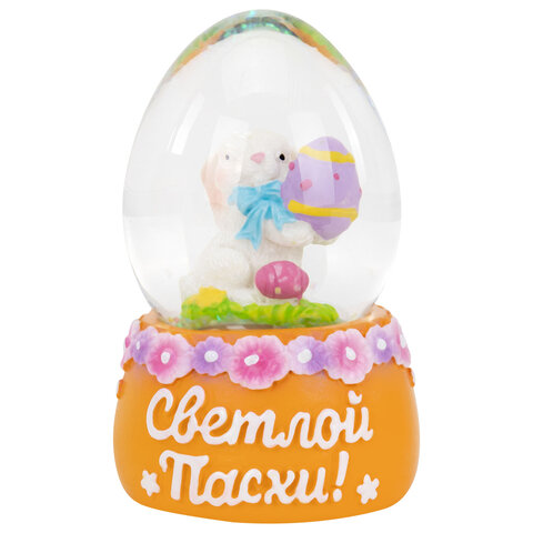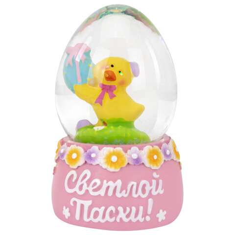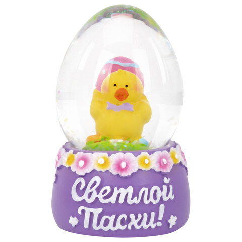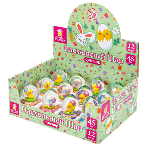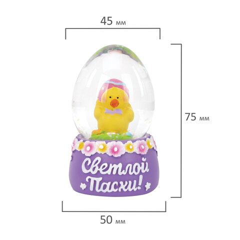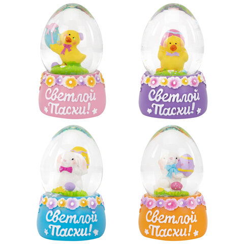 Сувенир представляет собой стеклянный шар со сказочной композицией из фигурок пасхальных персонажей внутри. На подставках, украшенных весенними цветами, написаны пожелания к празднику! Сувенир представлен в 4 уникальных дизайнах в ассортименте – каждый из них передаёт дух светлого праздника: пасхальные яйца, цветочные мотивы, цыплята, барашки, символы возрождения и весны.