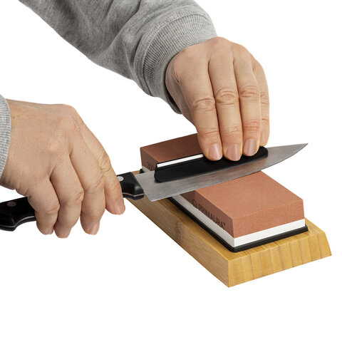 Погрузите камни в воду на 15-20 минут или до тех пор, пока не перестанут выделяться пузырьки. Достаньте камни и зафиксируйте их на противоскользящей подставке. Положите камень на бамбуковую подставку. За счет влаги появляется суспензия из воды и абразивных частиц, которые эффективно удаляют металл, обеспечивая высококачественную заточку. Заточка лезвия начинается со стороны с меньшей гритностью. Соблюдая угол заточки, проводите лезвием ножа по поверхности камня в течение 5-7 минут плавными движениями от себя. Периодически смачивайте камень водой. Когда заусенец перестал образовываться, переверните камень и повторите процесс заточки на стороне с большей гритностью. Затем возьмите следующий по гритности камень и повторите процедуру. Завершив использования, промойте камень и высушите.