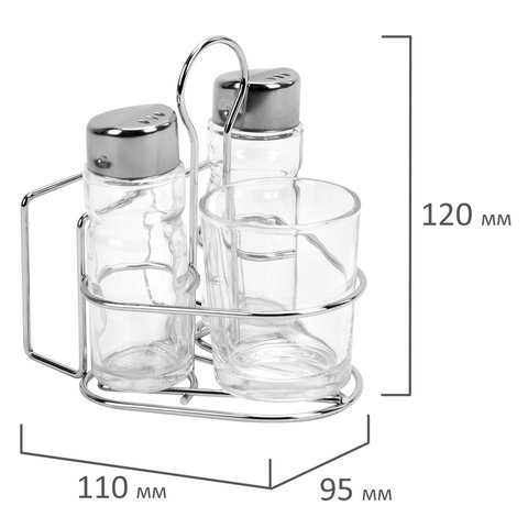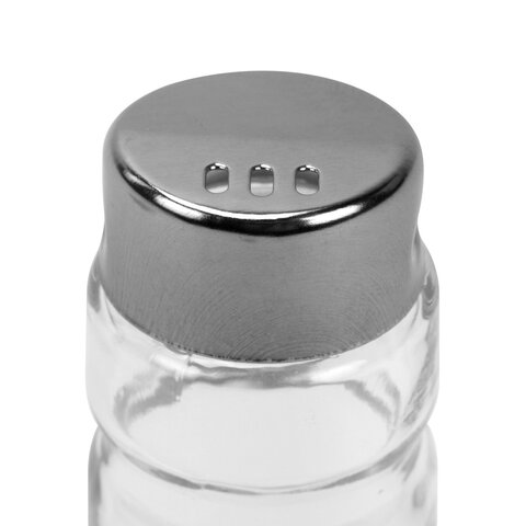 Емкость солонок выполнена из прозрачного пищевого стекла (натрий-кальций-силикатного), что позволяет видеть количество содержимого в емкости. Объем одной емкости составляет 50 мл (± 5 мл). Изделия оснащены откручивающейся крышкой из нержавеющей стали с отверстиями, которые обеспечивают контролируемую порционную подачу специй.