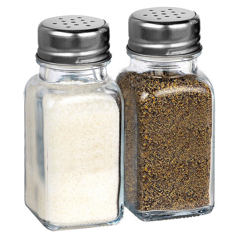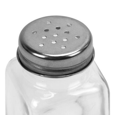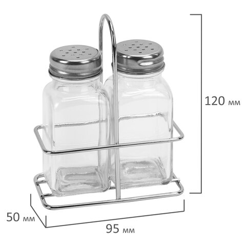 Емкость солонок выполнена из прозрачного пищевого стекла (натрий-кальций-силикатного), что позволяет видеть количество содержимого в емкости. Oбъем одной емкости составляет 80 мл (± 5 мл). Изделия оснащены откручивающейся крышкой из нержавеющей стали с отверстиями, которые обеспечивают контролируемую порционную подачу специй.