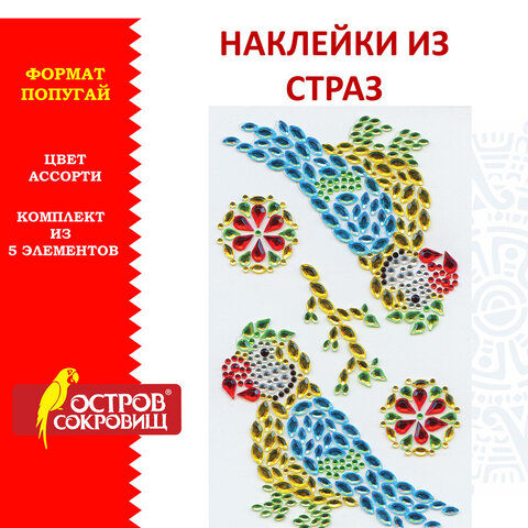 Наклейки готовые из страз ПОПУГАЙ, 5 декоративных элементов, 9,5 х 15,5 см, ОСТРОВ СОКРОВИЩ