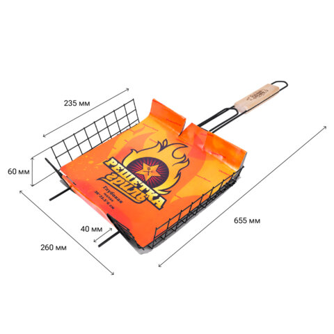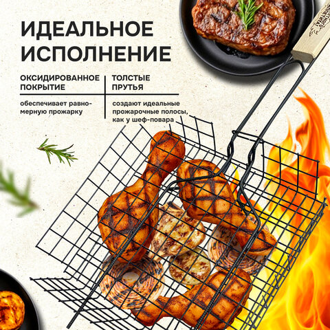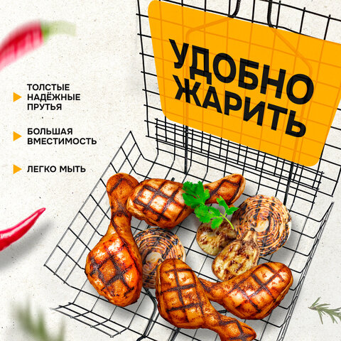 Прутики из прочной стали выдерживают высокие температуры и обеспечивают долгий срок службы. Оксидированное покрытие защищает от коррозии, устойчиво к огню и безопасно для здоровья. Конструкция плотно закрывается и надёжно удерживает продукты при готовке. Деревянная рукоятка не нагревается, удобно ложится в руку и защищает от ожогов.
