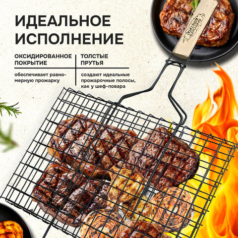 Прутики из прочной стали выдерживают высокие температуры и обеспечивают долгий срок службы. Оксидированное покрытие защищает от коррозии, устойчиво к огню и безопасно для здоровья. Конструкция плотно закрывается и надёжно удерживает продукты при готовке. Деревянная рукоятка не нагревается, удобно ложится в руку и защищает от ожогов.