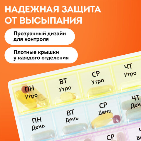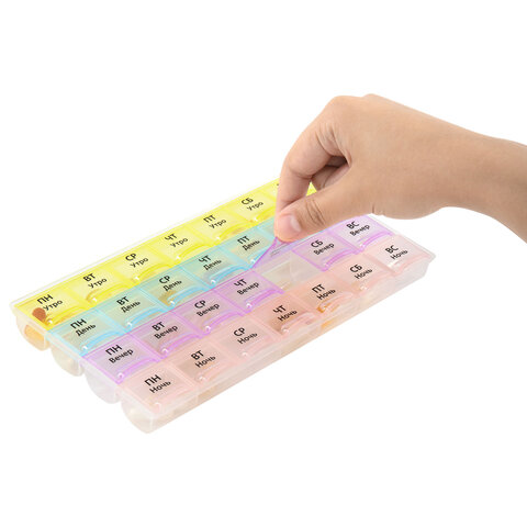 Прозрачный дизайн позволяет без труда контролировать прием лекарств. Каждое отделение оборудовано отдельной плотно закрывающейся крышкой, что предотвращает рассыпание содержимого.
