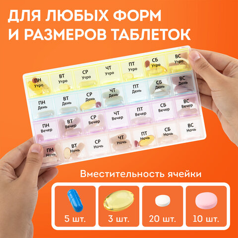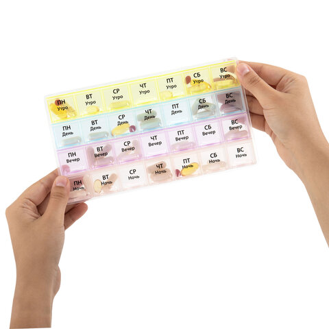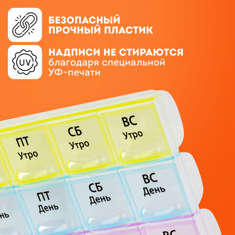 Отделения промаркированы крупным шрифтом по дням недели и суточному режиму приема: утро, день, вечер, ночь. Маркировка выполнена на русском языке при помощи специальной УФ печати. Надписи не сотрутся от длительного и частого использования.