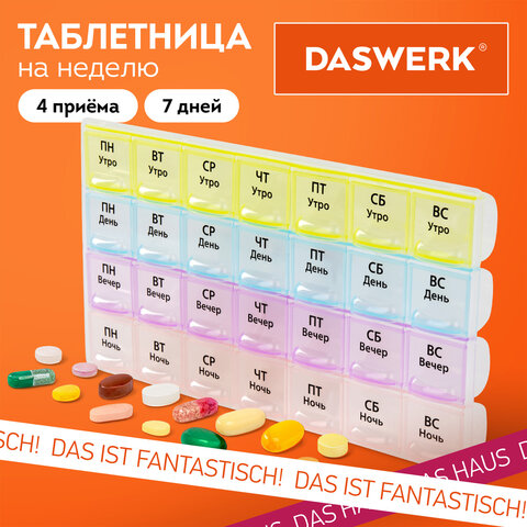 Купить ТАБЛЕТНИЦА / Контейнер для лекарств и витаминов "7 дней/4 приема", ПРОЗРАЧНЫЙ, DASWERK (ДАСВЕРК), 630845 вы можете в компании Канцтовары Карандашов, оформив заказ в интернет магазине, или