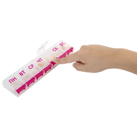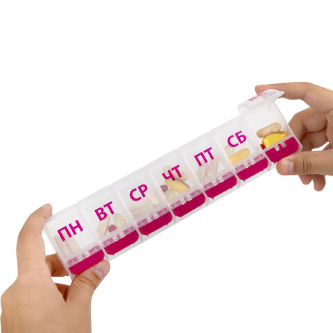 Прозрачный дизайн позволяет без труда контролировать прием лекарств. Каждое из 7 отделений оборудовано отдельной плотно закрывающейся крышкой, что предотвращает рассыпание содержимого. Таблетница оснащена уникальной кнопкой для открытия/закрытия крышки ячейки, обеспечивающей дополнительную надежную защиту.