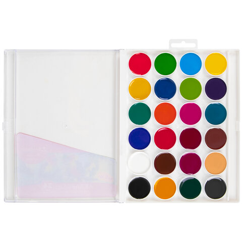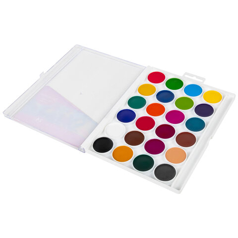 24 ярких насыщенных цвета отлично смешиваются между собой и позволяют создать множество оттенков, обеспечивают однородное окрашивание. Краски быстро высыхают и не портятся со временем. Безопасны для детей, нетоксичны. Выпускаются в пластиковом пенале с европодвесом, прозрачной крышкой, кюветами круглой формы и отделением для кисточки. Упаковка обладает компактными размерами и легким весом.