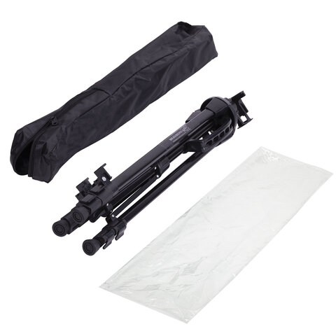 Поставляется в комплекте с черным чехлом на молнии и ремешком, обеспечивающим удобство транспортировки при выездных работах. Легко складывается, удобен для переноски. Максимальный размер в рабочем состоянии – 92х156х80 см. Минимальный размер в рабочем состоянии – 39x54x39 см. Вес – 1,42 кг. Упакован в пакет и белую коробку.