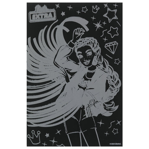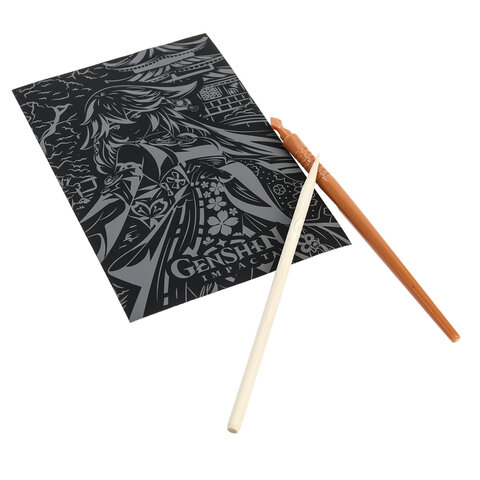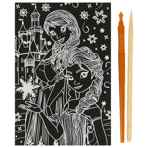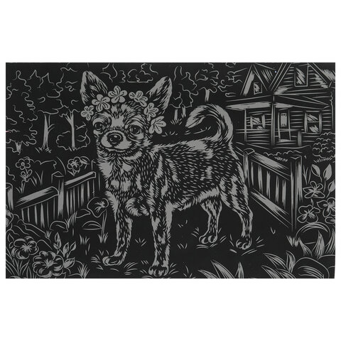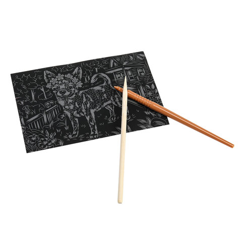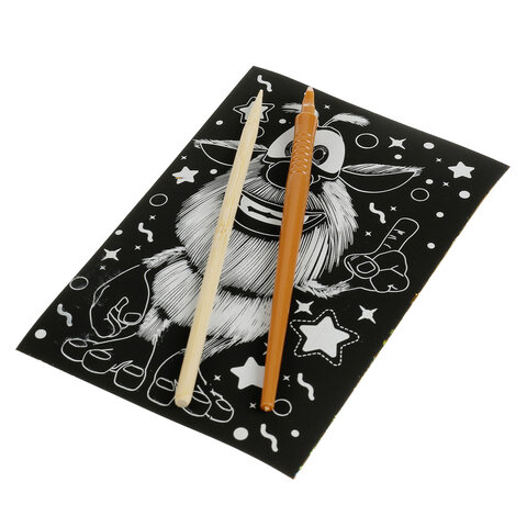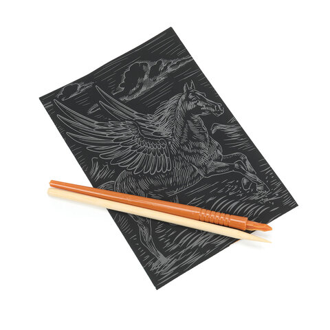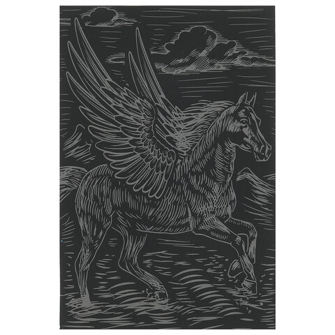 Контур рисунка уже нанесен на черный фон. С помощью специального штихеля изображение процарапывается, и из-под слоя краски появляется основа (золотая, серебряная, голографическая). В результате получается контрастный рисунок. Набор содержит все необходимое для создания оригинальной картины: основу с контуром, штихель, инструкцию.