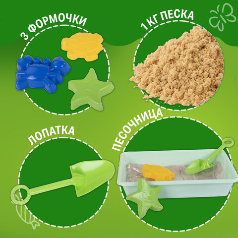 Состав набора: кинетический умный песок - 1 кг, пластиковая песочница для веселой игры 20х30х6 см - 1 шт., формочки для создания морских обитателей (черепаха, морская звезда, краб) - 3 шт., лопатка - 1 шт.