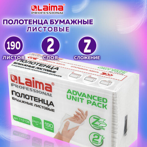 Купить Полотенца бумажные (1 пачка 190 листов) LAIMA (Система H2) ADVANCED UNIT PACK, 2-слойные, 24х21,6 см, Z-сложение, 112138 вы можете в компании Канцтовары Карандашов, оформив заказ в интернет магазине, или