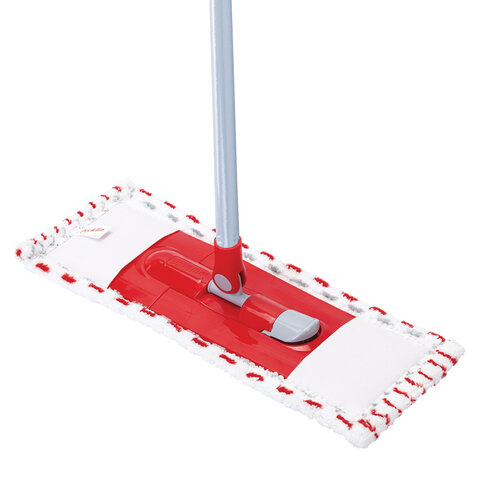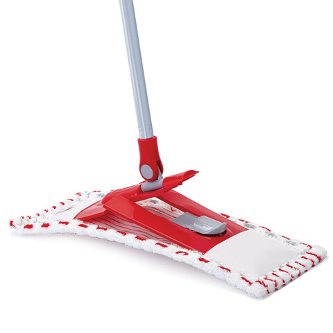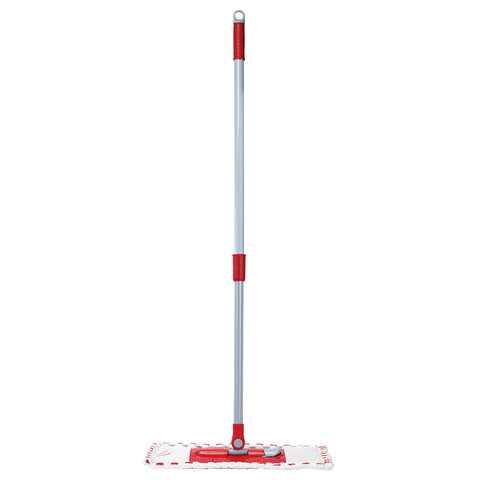 Основание швабры выполнено из износостойкого пластика. За счет подвижного соединения рукоятка вращается на 180 градусов вдоль длинной и короткой части основания, позволяя с легкостью обходить мебель, проникать в труднодоступные места и экономить время.