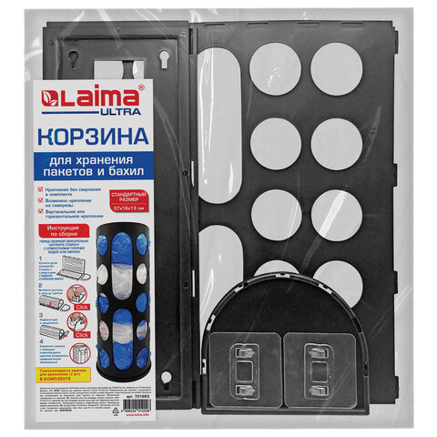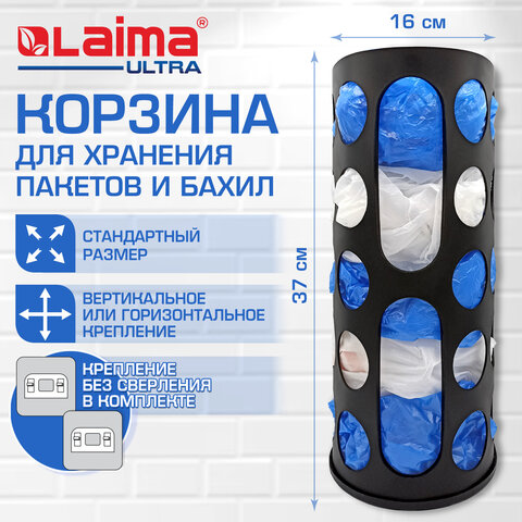 Купить Корзина / диспенсер для хранения пакетов и бахил СРЕДНЯЯ 37х16х13 см, крючки-крепеж в комплекте, черная, LAIMA ULTRA, 701663 вы можете в компании Канцтовары Карандашов, оформив заказ в интернет магазине, или