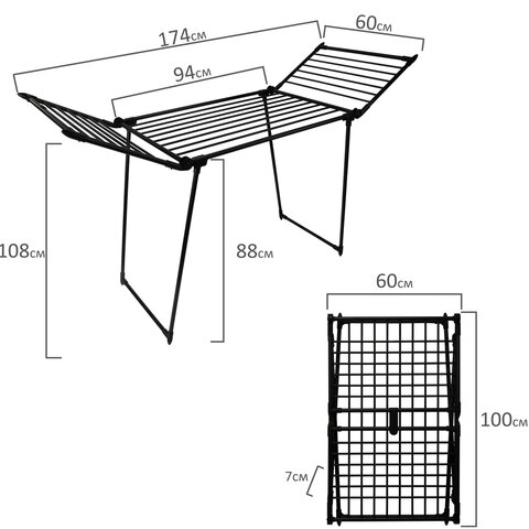 Размер – 60х94х88 см в сложенном виде и 60х174х108 см с разложенными с двух сторон створками. Выдерживает нагрузку до 40 кг. Устойчивая, вместительная и компактная в хранении, при необходимости быстро и легко складывается и убирается. Заменяет до 19 метров бельевой веревки!